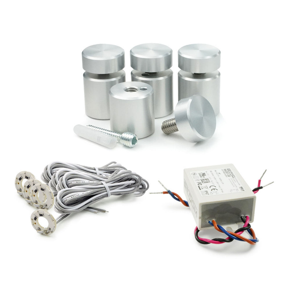 This 1" diameter standoff kit includes all the mounting hardware you need plus the white LED discs and a power supply. If you need more than four standoffs for your sign, you can purchase an expansion pack from our accessories below.