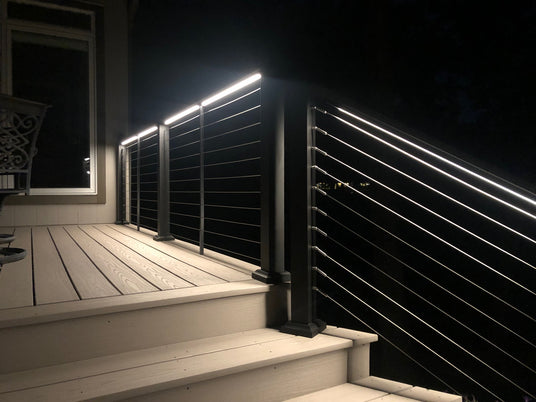 A lighted handrail is a useful and stylish addition to your staircase! Integrating LED lighting into your handrail improves visibility while also creating a striking visual effect as you move up or down the stairs.
