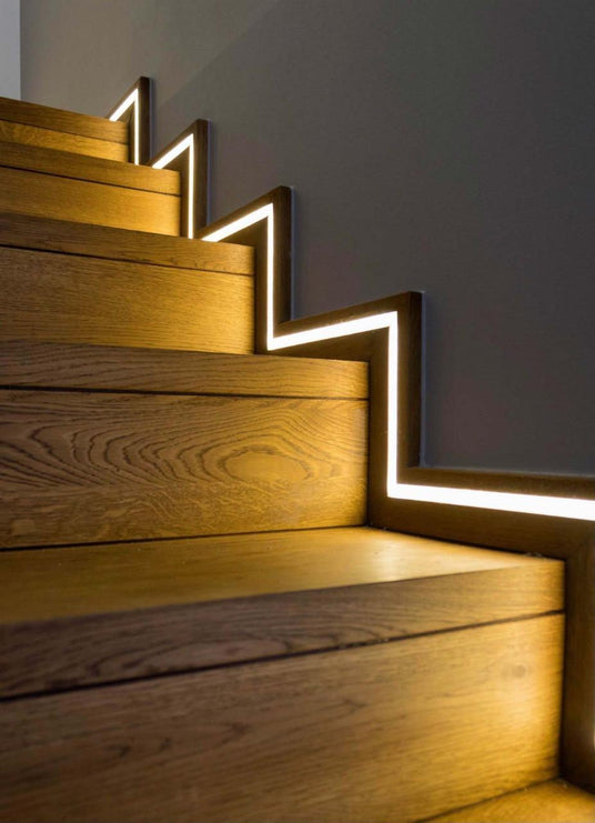 This lighting technique not only looks great, but it also improves the safety of your stairs by clearly marking each step. It's a stylish way to brighten up your staircase while maintaining a modern vibe!