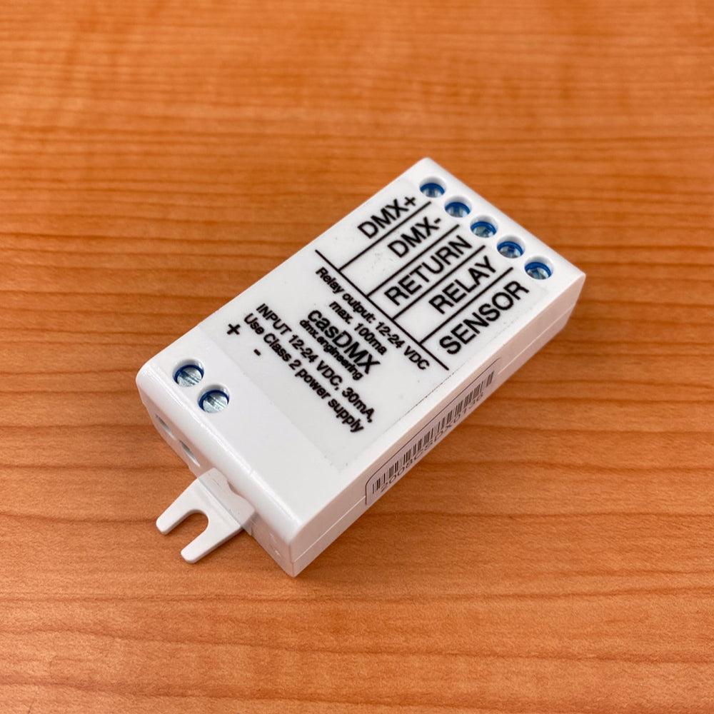 The casDMX controller functions as part of a Casambi mesh network and can drive one DMX-512 universe to control industry-standard DMX lighting devices and fixtures. It is connected to a 12-24V DC power supply and provides a non-isolated DMX-512 master output plus a relay output and a sensor input.