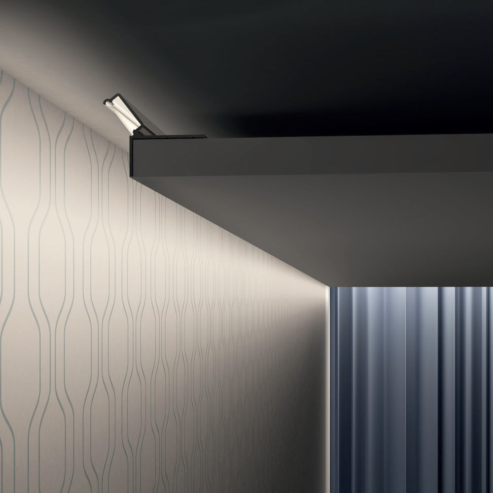 If you’re wondering how to hide LED strip lights on the ceiling, our plaster-in LED profiles are the answer. In addition, they are perfect for LED cove lighting, false ceiling lights, coffered ceiling lighting, or any indirect ceiling perimeter lighting. Whereas, the unique minimalist design of this profile is convenient for various LED indirect lighting fixtures.