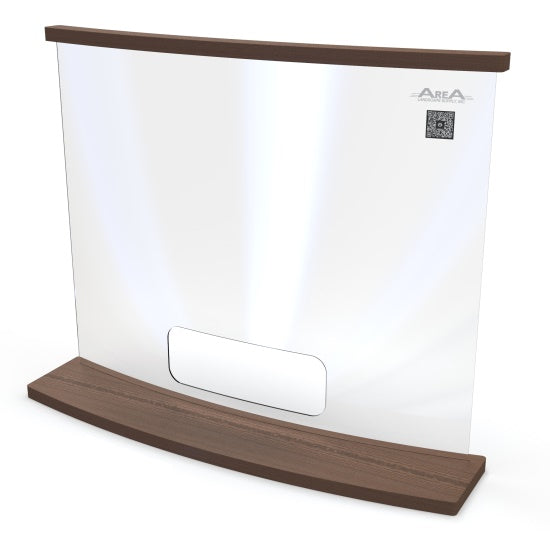 This curved, free-standing desktop sneeze guard is the perfect complement to your upmarket reception desk or office space. The wooden base and top rail maintain the curve of the acrylic panel and give a sophisticated finish to the sneeze guard.