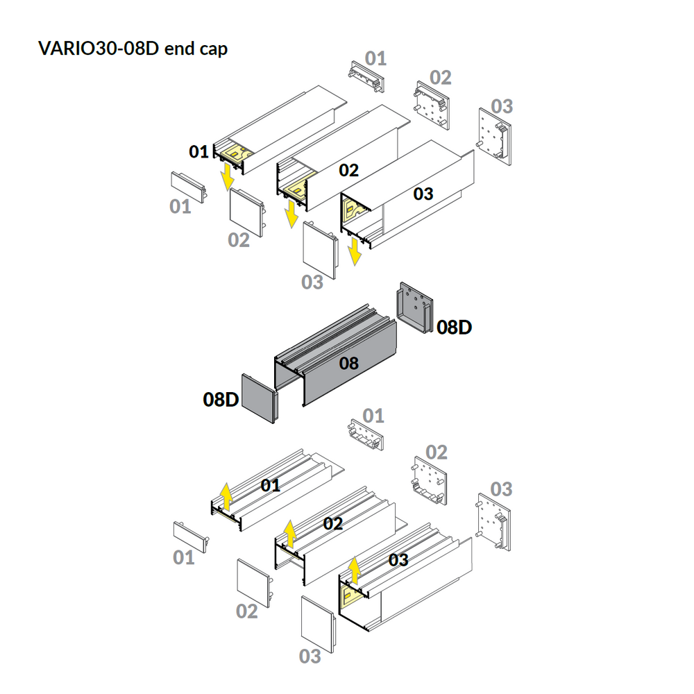End caps provide a professional finish to the lighting fixture. These end caps are typically used where Vario30-08 is used to create a double sided luminaire in combination with primary Vario30 lighting profiles.