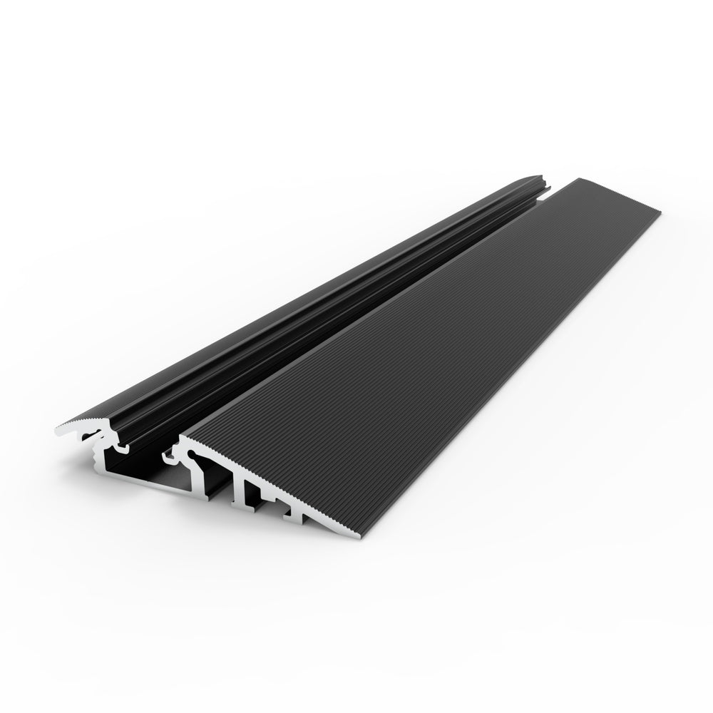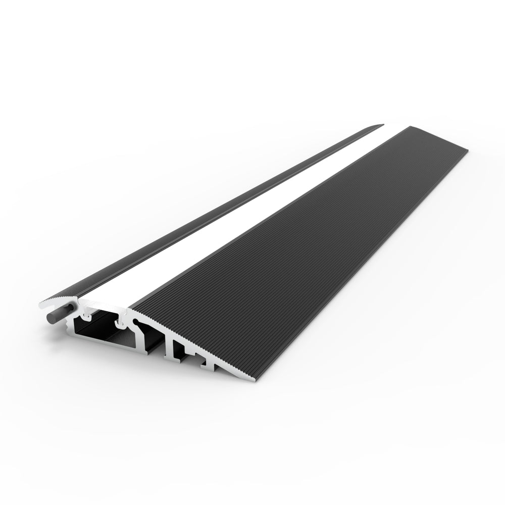 The Broadway profile is a specialty floor lighting LED channel designed and manufactured in the USA. This treadable floor transition strip LED channel is built for indoor applications, providing both functional and aesthetic lighting. It is specifically engineered to create illuminated transitions between hard floor surfaces such as tile, stone, or concrete and softer flooring types like carpet, parquet, or laminate wood.