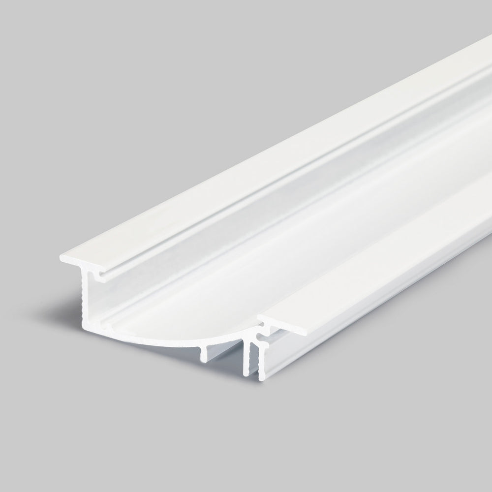 You can use this indirect lighting LED profile to create cove lighting in sheetrock and plasterboard walls or gypsum ceilings. The LED strip is installed out of sight, and the parabolic reflector offers a soft, diffused pool of light.