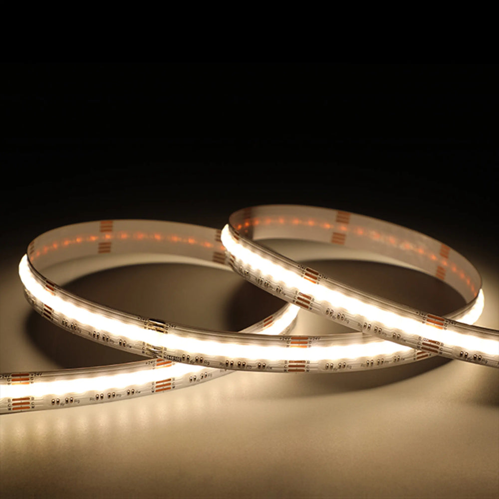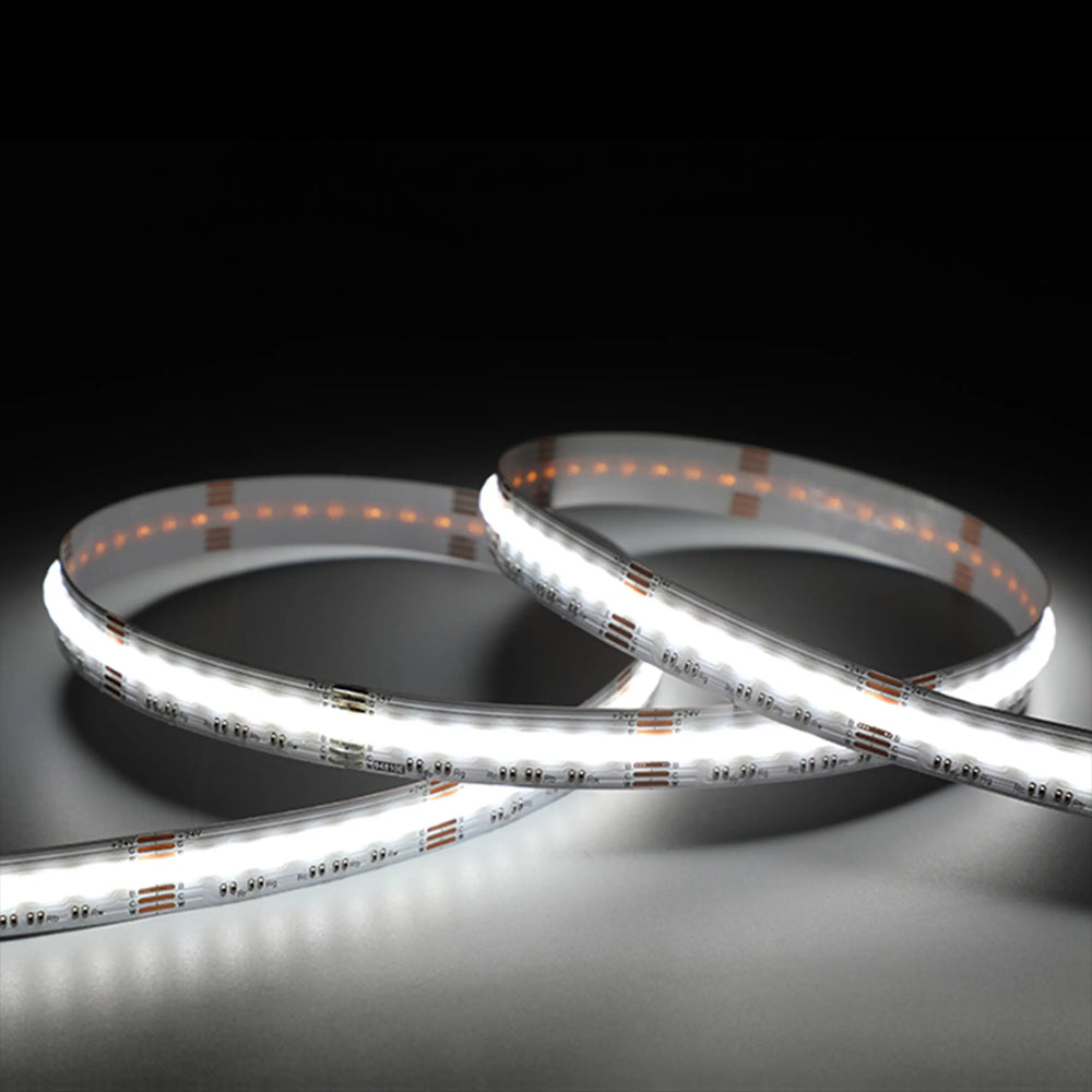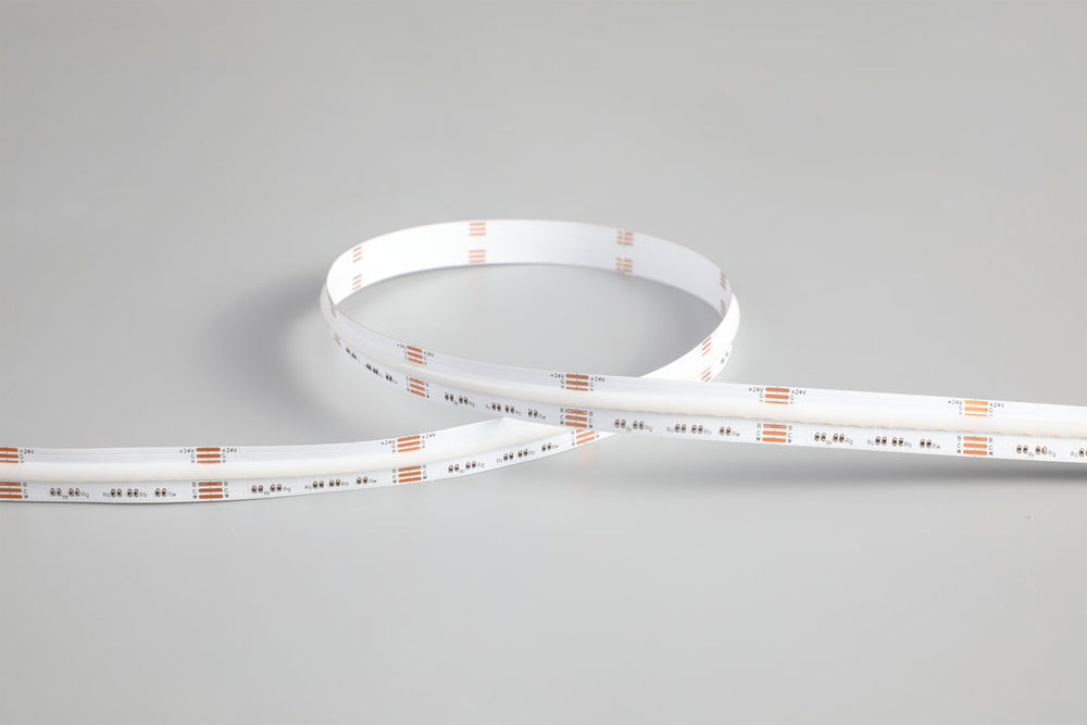 The UniColor IP20 COB series is an RGB+CCT LED strip with UniColor COB technology that delivers smooth, dot-free lighting. It supports full RGB color mixing with tunable white light from 2700K to 6000K, and a high CRI 90+ for accurate color rendering in accent, architectural, and interior lighting applications.