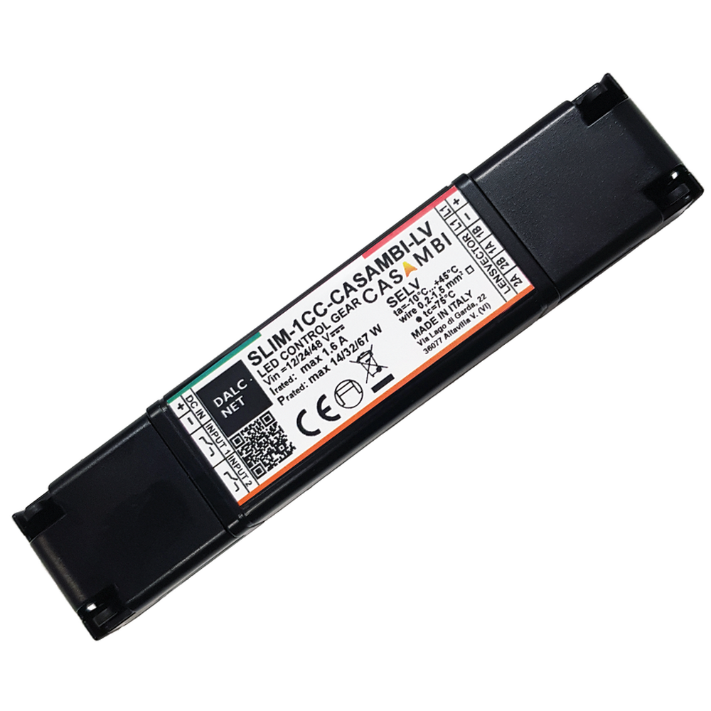 The SLIM-1CC-CASAMBI-LV is a professional LED dimmer designed for precise control of constant current LED lighting systems. It operates on a wide 12-48V DC input voltage range and can deliver up to 1.6A of output current. The dimmer is seamlessly controlled via the intuitive Casambi app on your smartphone or tablet, allowing easy adjustment of light levels from anywhere.