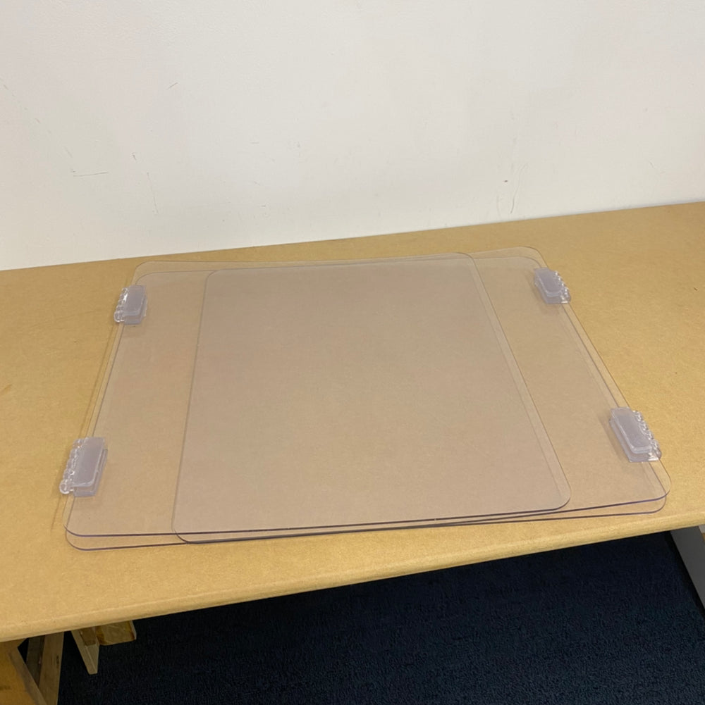 - Trifold Clear PETG or Polycarbonate Desk Guards with hinged corner on each side enabling the unit to be folded and stored.